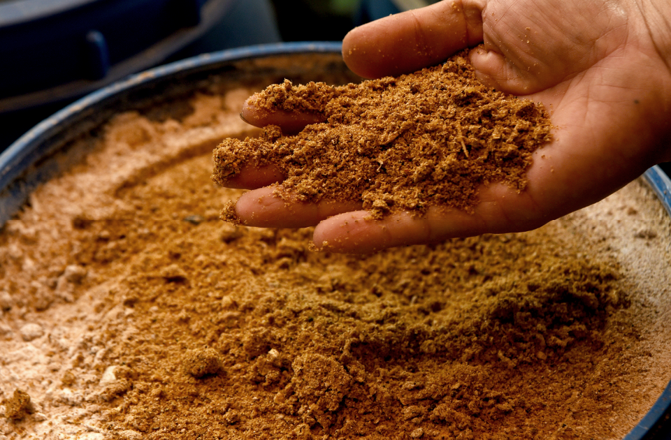 製米工程で出た米ぬかに、魚粕、蟹ガラ、昆布などを混ぜて1年以上寝かして自家で生産している『こまがた農園』のぼかし肥料。これが、美味しい、安心安全な米作りのベースとなっている。