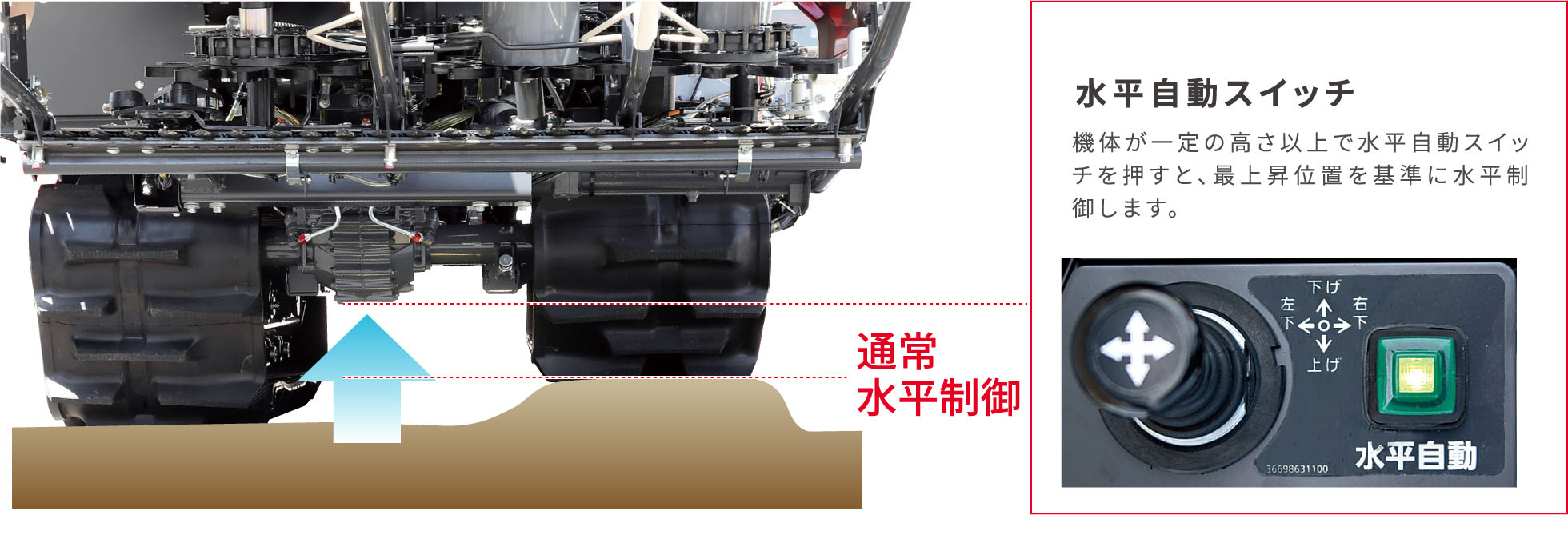 下位置を基準にする水平制御と、上位置を基準にする水平制御の切替ができます。ほ場の凹凸に合わせて機体を水平に保ち、ハイクリアランス設計との相乗効果で、湿田でも安定した高精度な作業が行なえます。