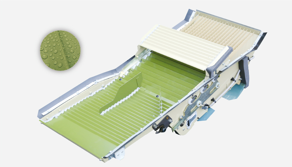 フッ素樹脂でコーティングされた揺動流板を採用。こく粒の滑落性と分散性を促進し、濡れ材適応性と選別効率を向上させます。