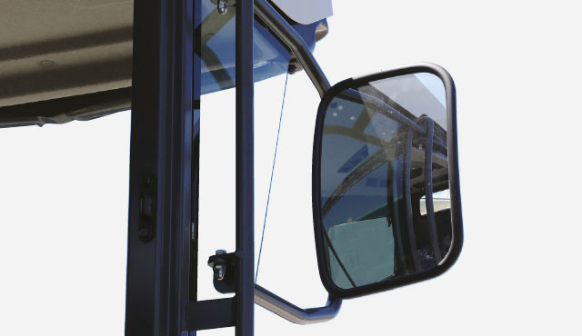 ワイドで視認性に優れ、高い防塵性でさらに快適になったキャビン空間。キャビン右側に、後方を確認しやすい大型バックミラーを装備。内外気切替式エアコンで、気候を問わず快適空間で作業できます。FM/AMラジオ付のUSB外部入力端子付プレーヤーを装備。