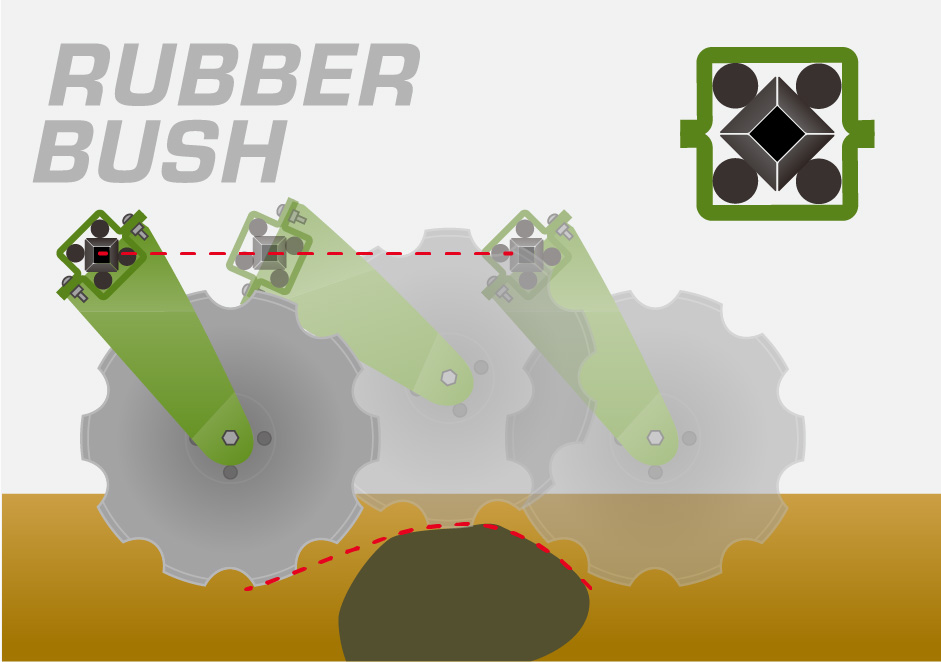 各々のディスクにゴムブッシュ(独立懸架サスペンション)を搭載。障害物に当たっても上方へ逃げ、自動復帰するので、安心して作業が行えます。