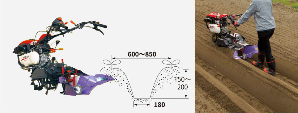 野菜全般に対応可能。なだらかな丸型のうね作り、中耕培土作業