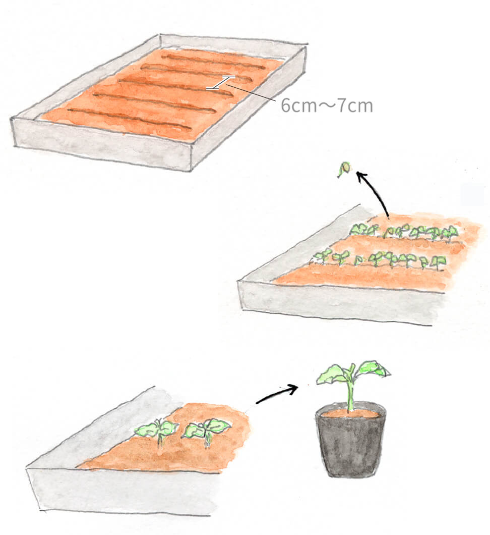 本葉2枚のとき、苗ポットに1本ずつ植えかえ、本葉5~6枚になるまで育てます。