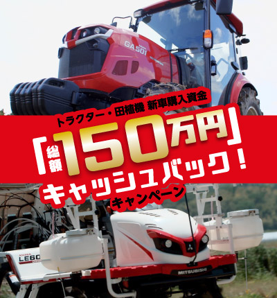 ※指定期間内に新車(実演機など除く)で対象製品を三菱農機販売㈱または三菱農業機械取扱販売拠点(JA含む)でご成約/納品していただくことが条件です。