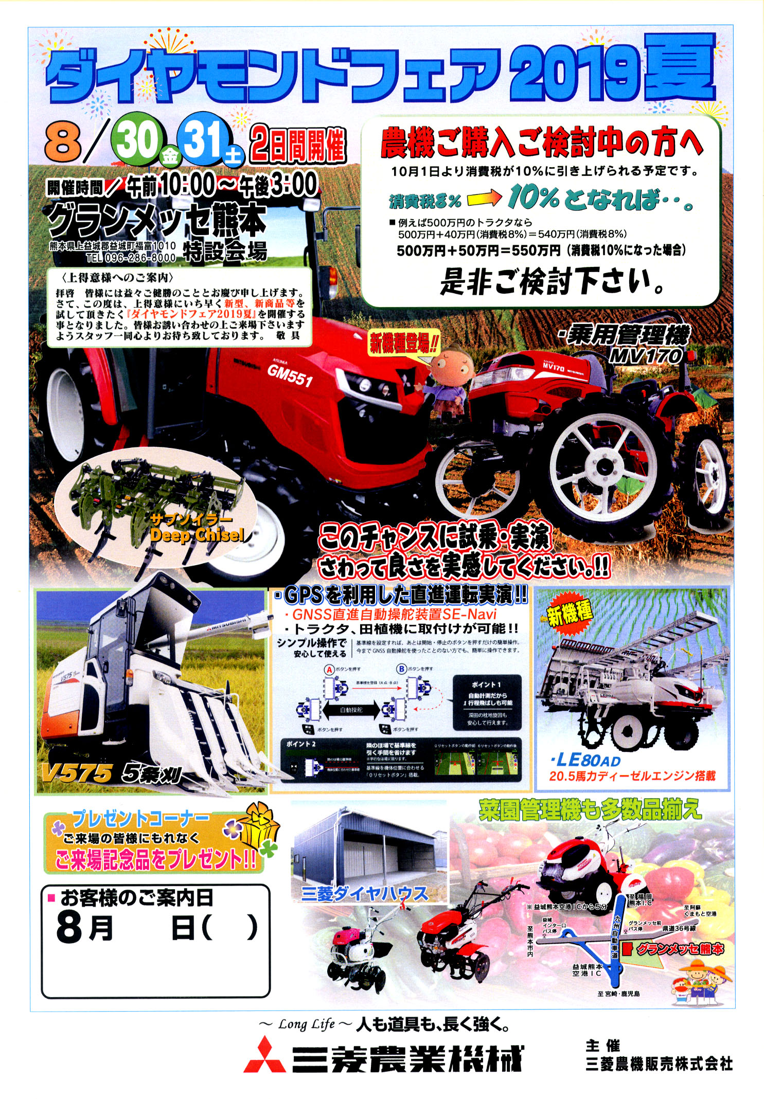 | 開催場所 | 三菱農機販売株式会社 中部支社 奥越営業所敷地内 〒912-0011 福井県大野市南新在家10-24 TEL0779-65-0038 |