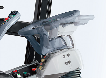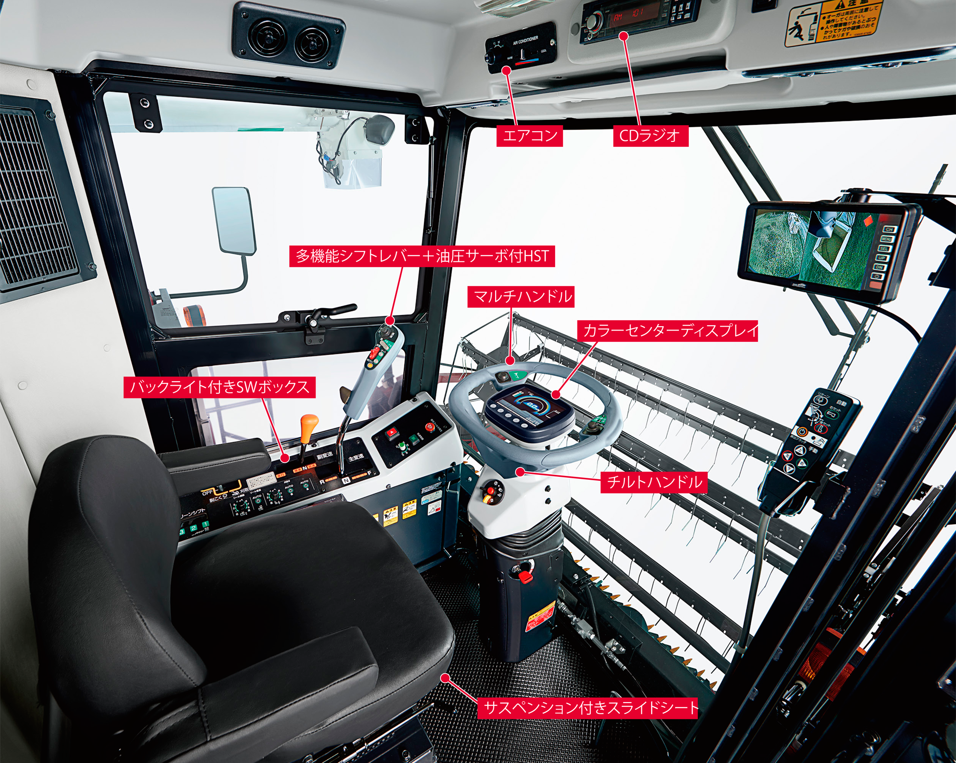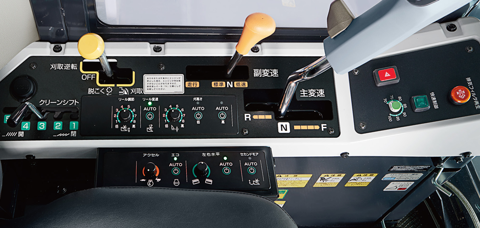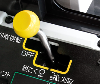 反応のよい丸ハンドルで、乗用車感覚で運転できます。条合わせや四隅の枕刈り、隣接条への進入も簡単です。また右手側にある4方向スイッチで、リール回転の微調節とリール昇降の操作ができます。