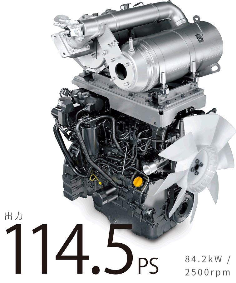 ハイパワー・低燃費を実現するコモンレールエンジンを搭載。排ガス中のNOxを大幅に削減する尿素SCRシステムと、PM(粒子状物質)を捕集・除去するDPFを備え、排ガス規制をクリアしています。