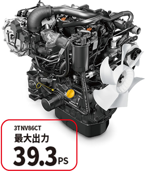 DPF付電子制御コモンレール式エンジンを搭載。コモンレール式のパワーと低燃費、 低NOx化に加え、排ガス中のPMを処理するDPFフィルタで環境に配慮したエンジンです。