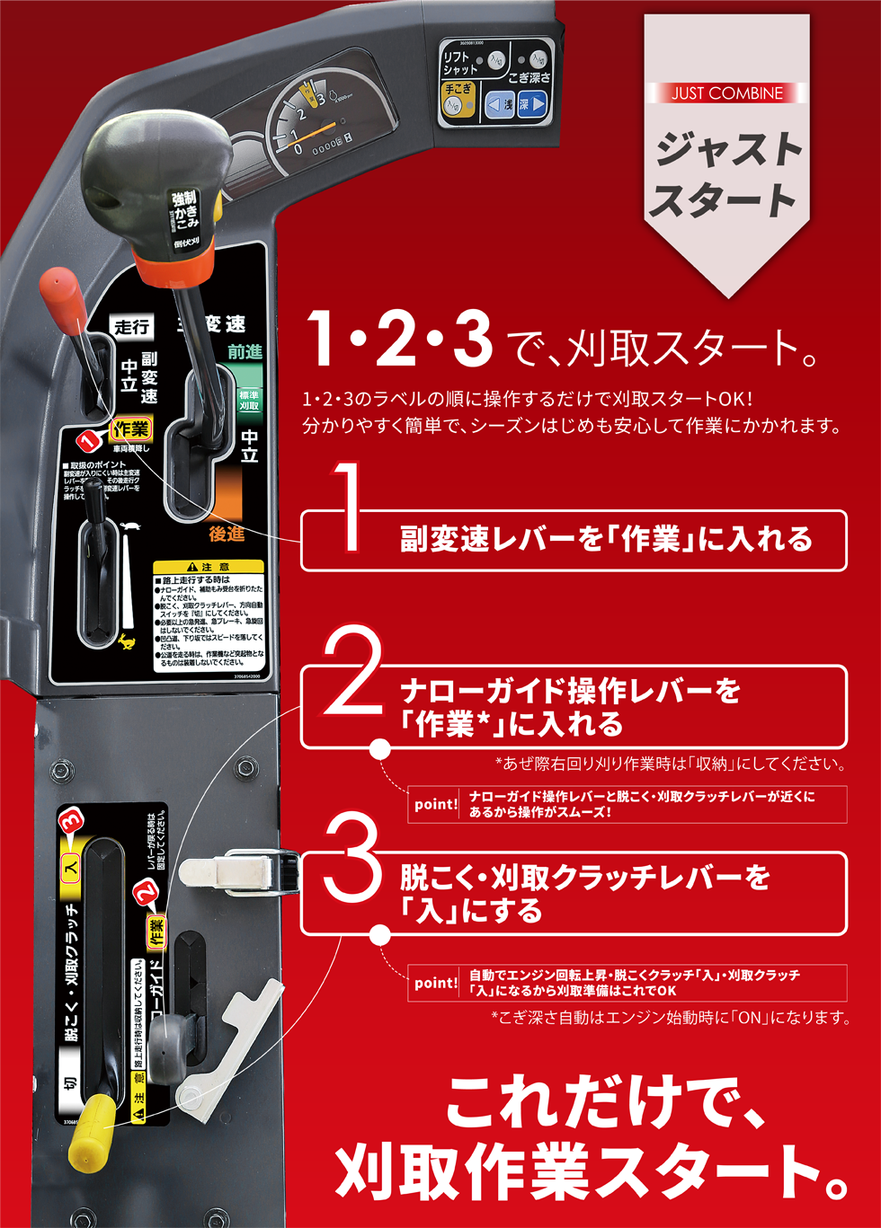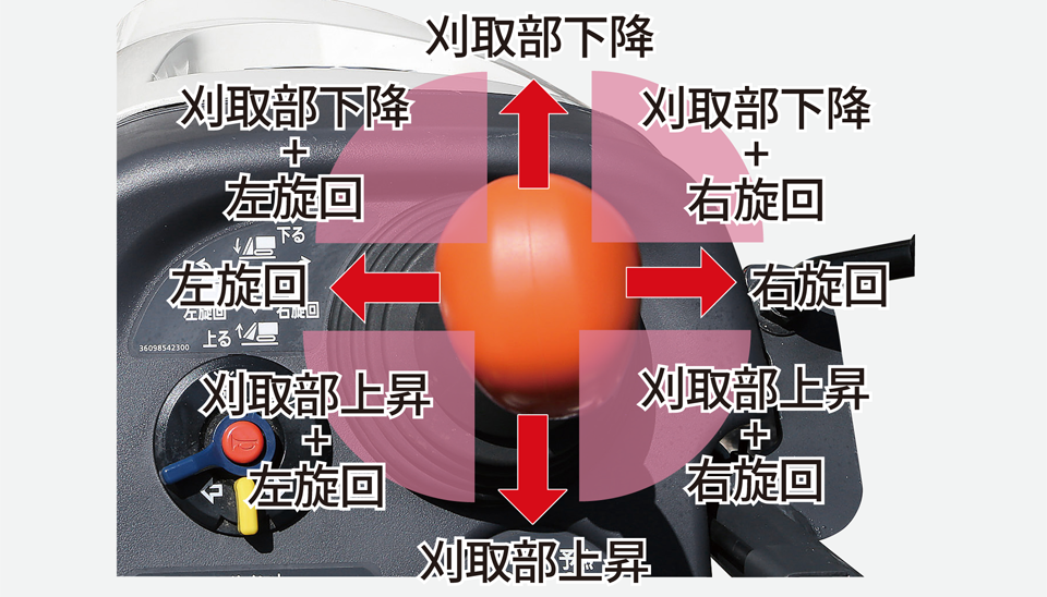 機体の左右旋回と刈取部の上下操作が同時にできます。人間工学に基づいたレバー形状で操作がより楽になりました。