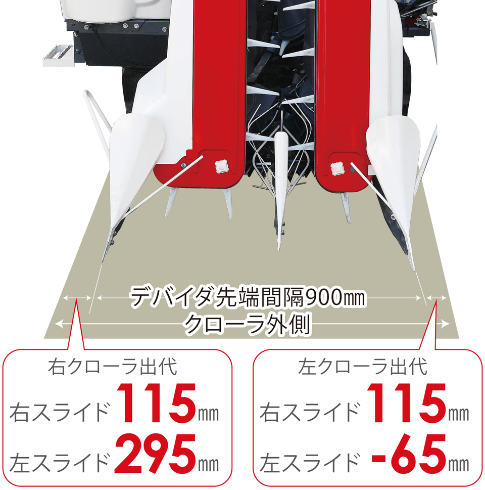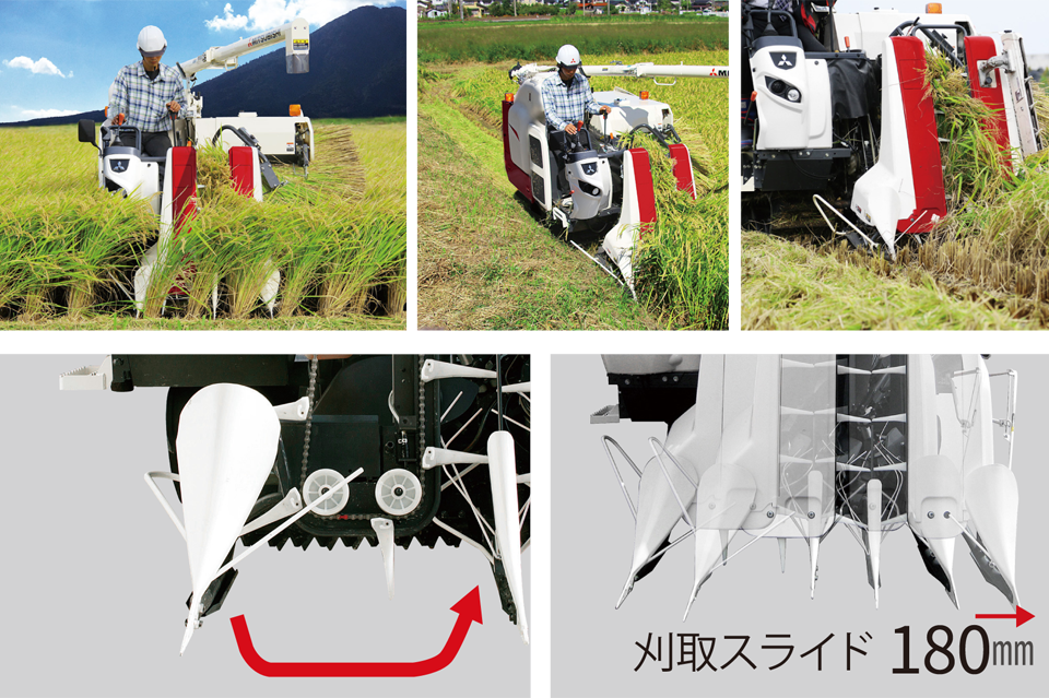 ワイドレンジピックアップと合わせて刈取部スライド機能を搭載しており、様々な状況でも安定した刈取を実現します。 -