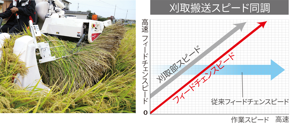刈取搬送とフィードチェンが車速に同調。