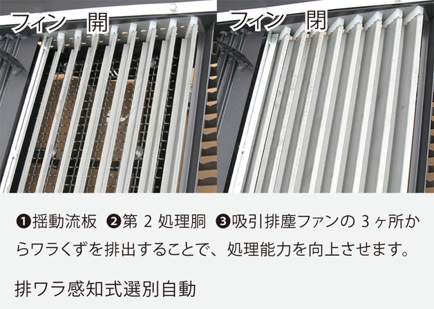 排ワラ量に応じて自動でフィンが開閉し、選別精度が向上。材料条件、ほ場条件によって細かな選別設定が可能です。