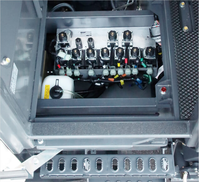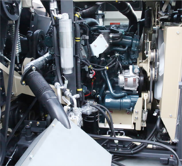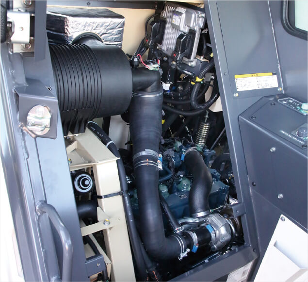 座席シート後ろ、エンジン後方カバー、運転席ステップ下カバーを大きくオープンできます。エンジン部や油圧部品のメンテナンス性に優れています。