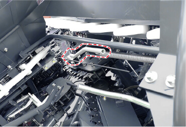 搬送ガイドオープン後、さらに手動で刈取部の搬送チェンを正逆動かせます。