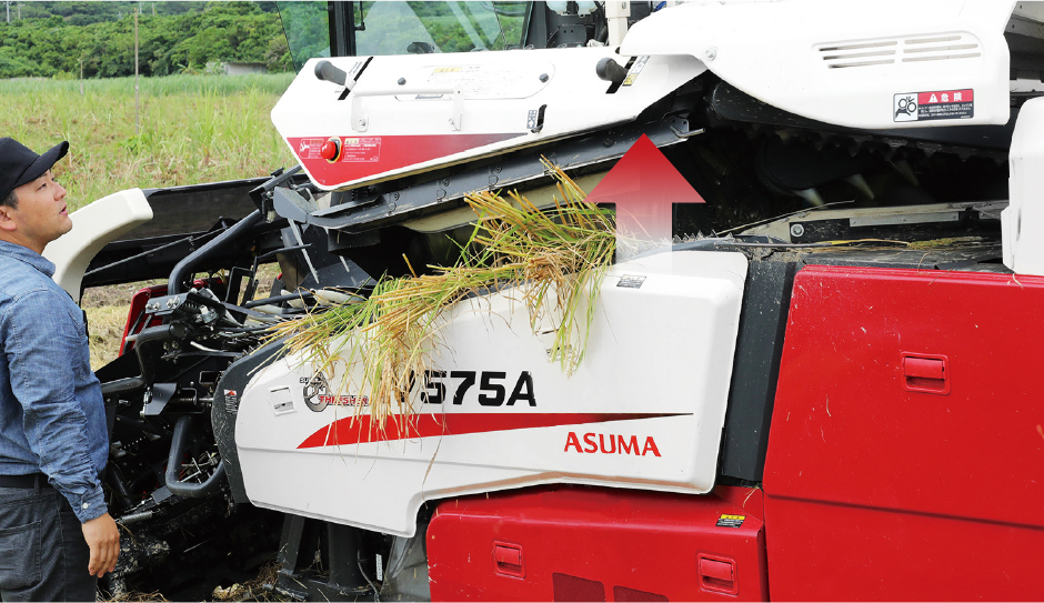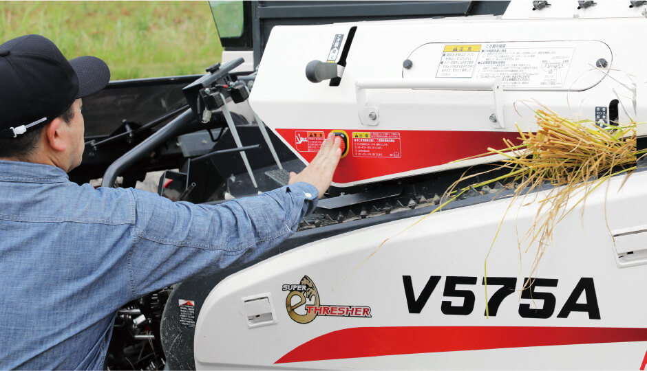 スイッチを押せば即座にエンジンと脱こく・搬送チェンが停止し、こぎ胴が自動でオープンします。万が一異物がかみ込んだ時でも、機体へのダメージを最小限に抑えます。