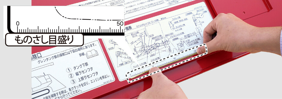 ベルトサイズ一覧表のラベルにものさし目盛りを追加。メジャー等がなくてもベルトセットやスキ間寸法の調整・確認ができます。