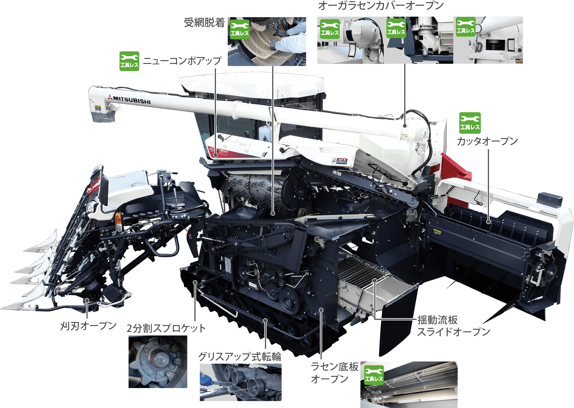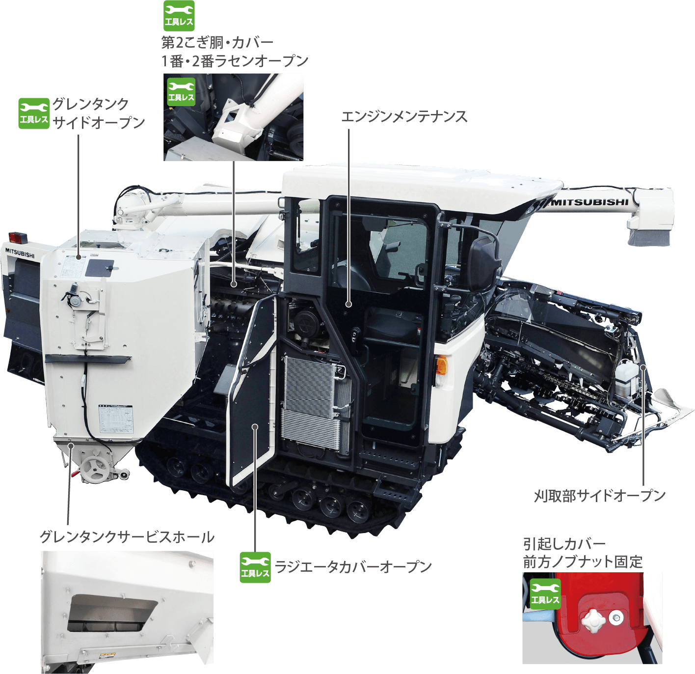 ノブやレバー操作だけで刈取搬送部が簡単にオープンできます。