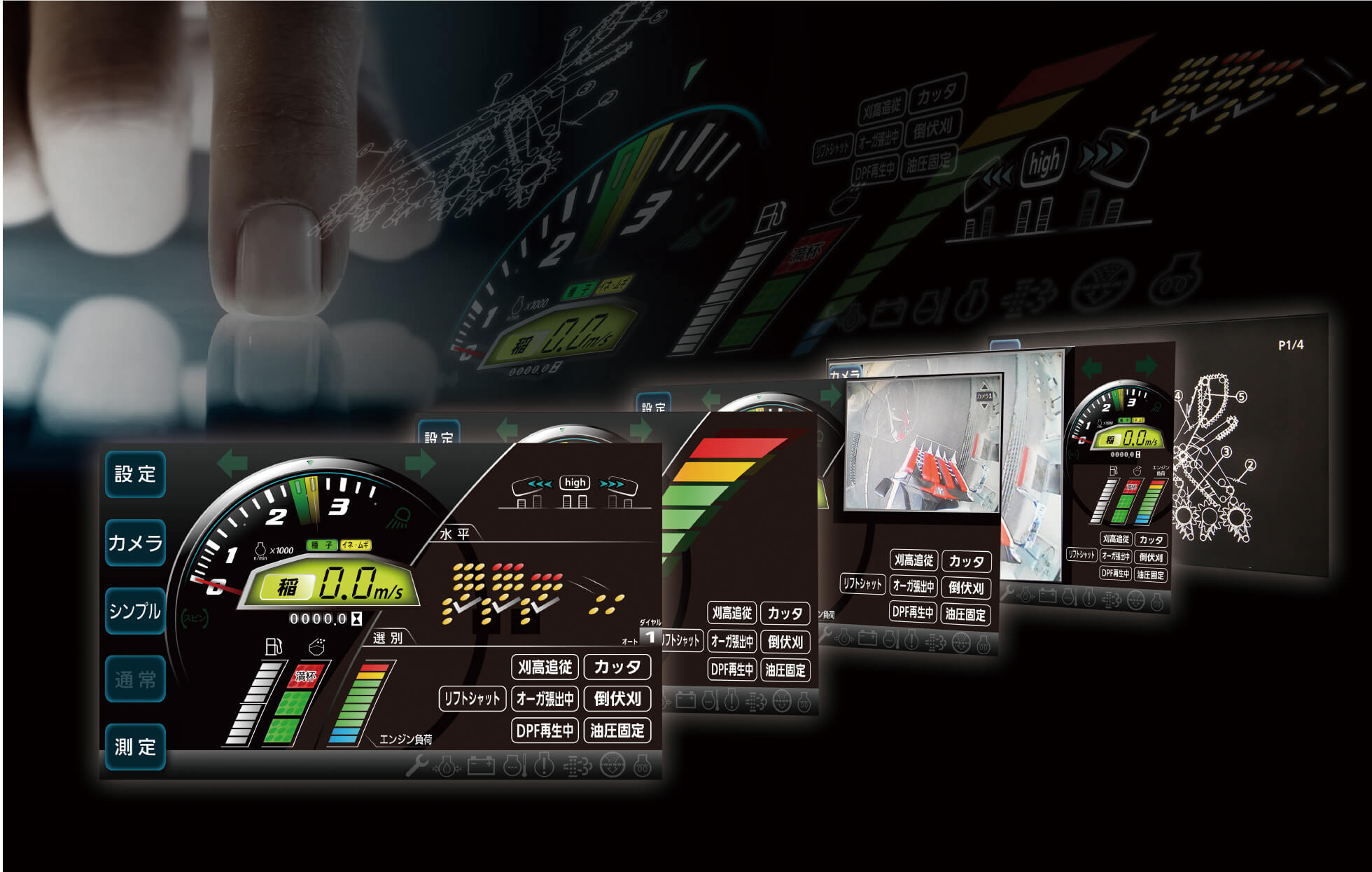作業の状況や異常時の対応などをリアルタイムに詳しく表示する、タッチパネル式の液晶カラーモニタを採用。指で画面をスライドするだけで必要な画面表示に切替できます。またタッチパネルとボタンの両方が操作可能で、手袋をしていても使用できます。
