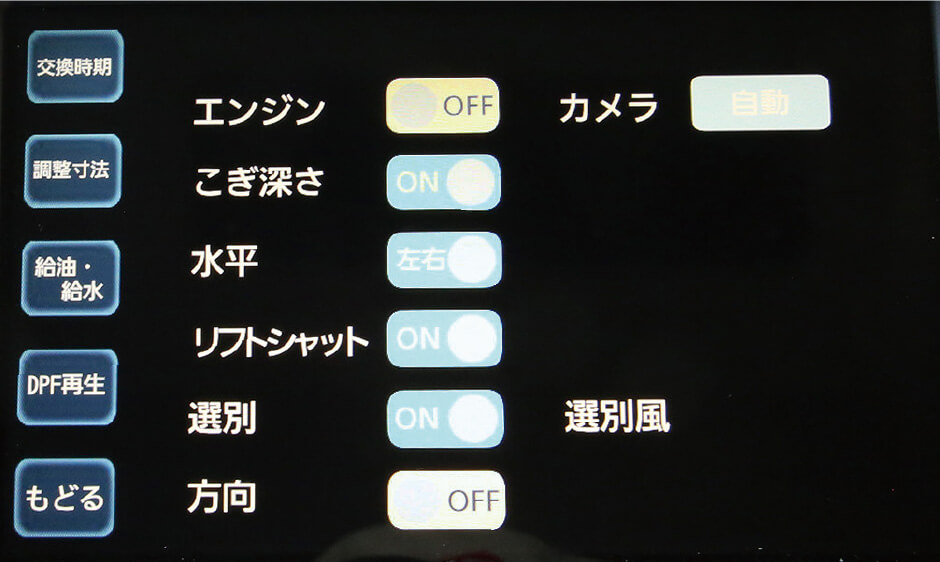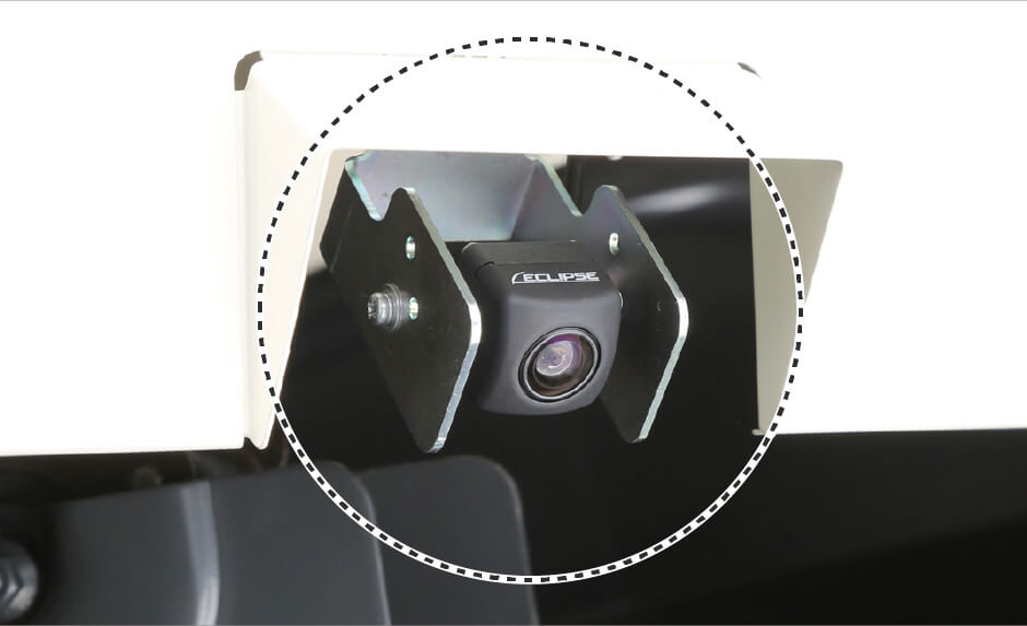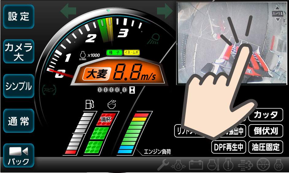 画面上のカメラモニタで機体前後の状況を目で見て確認。後進時、自動でバックカメラに切替り、視認性が向上しました。