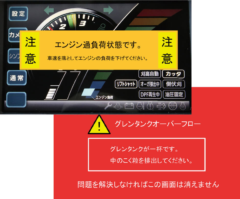 万一のトラブル時に注意や警告を画面上で知らせます。