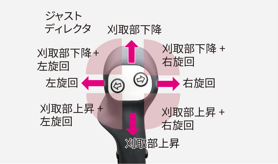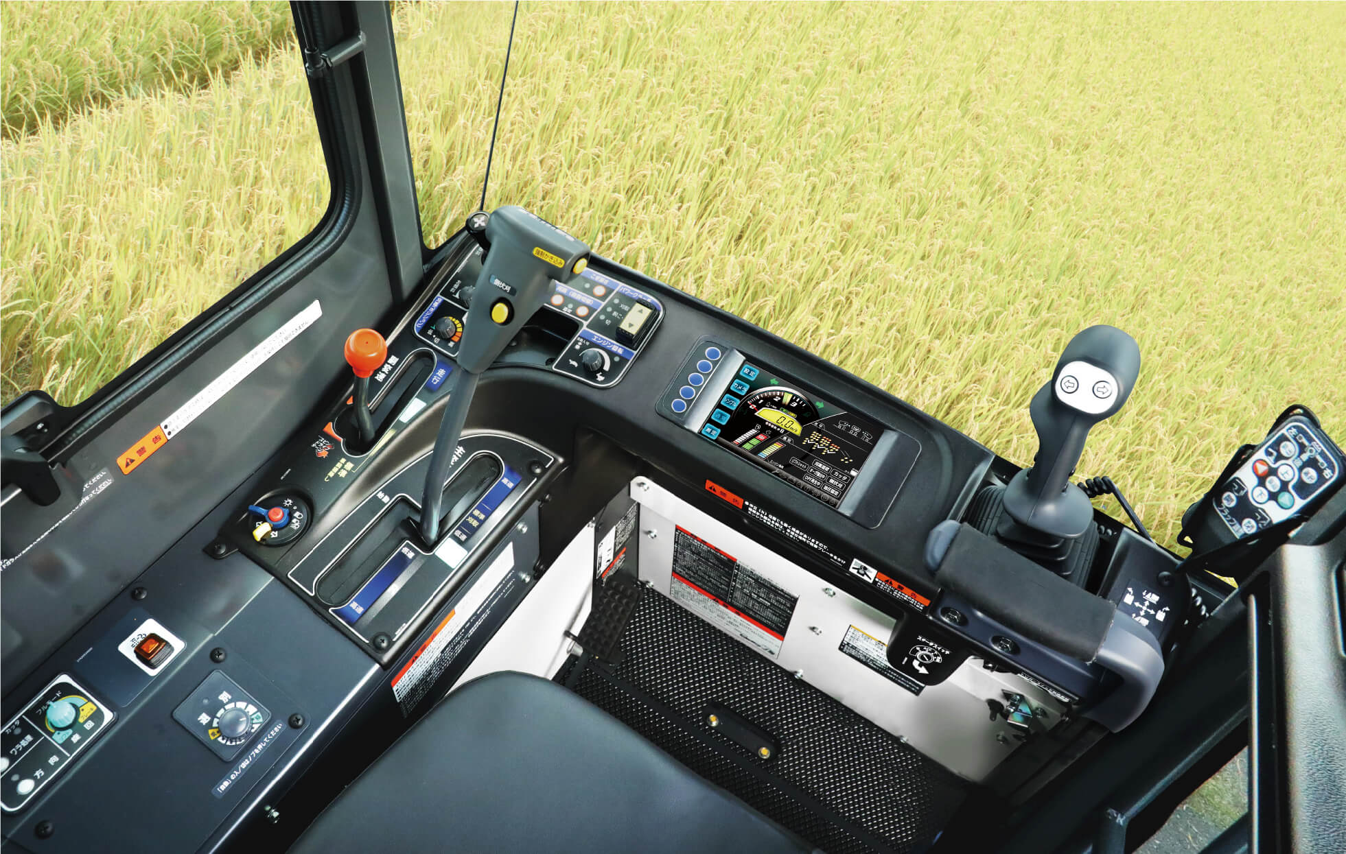 マルチステアリングレバーは機体の左右旋回と刈取部上下の同時操作ができ、アームレストに腕を置けば、オペレータの疲労を更に軽減します。またジャストディレクタで条合わせの微調整も簡単にできます。