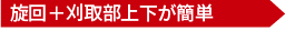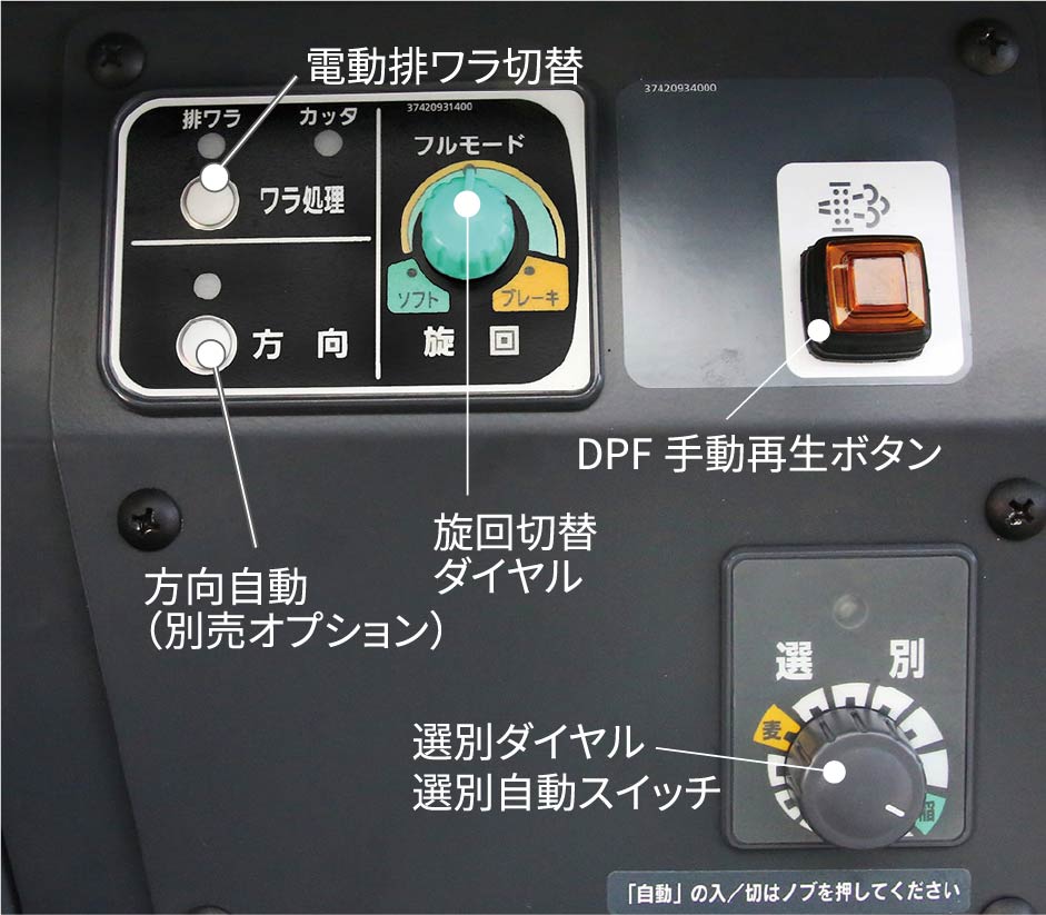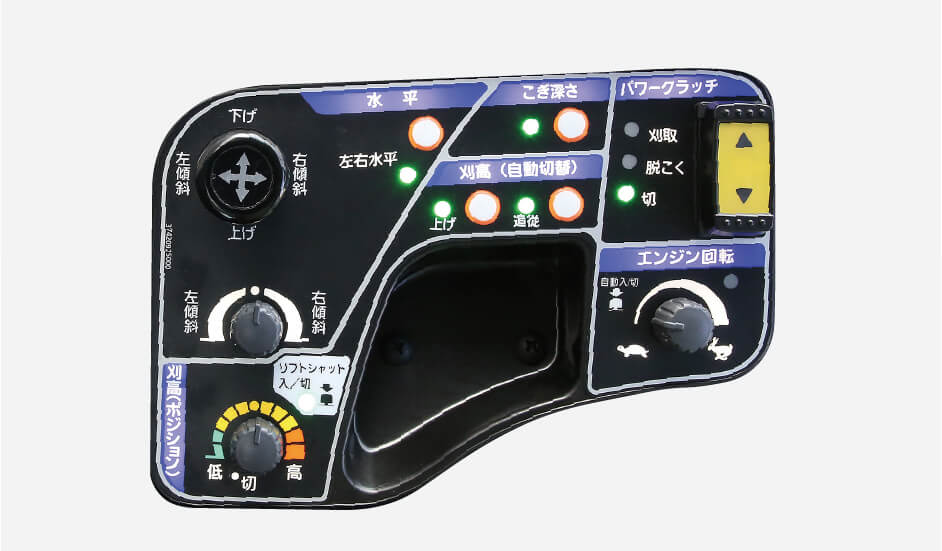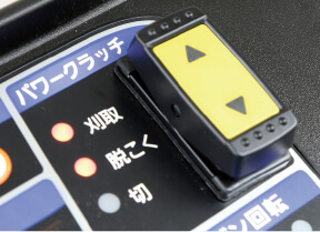 ボタンで簡単に脱こく・刈取スイッチの「入」・「切」ができます。万一刈取作業中に緊急エンジン停止しても、再スタート時は簡単にエンジン始動できます。
