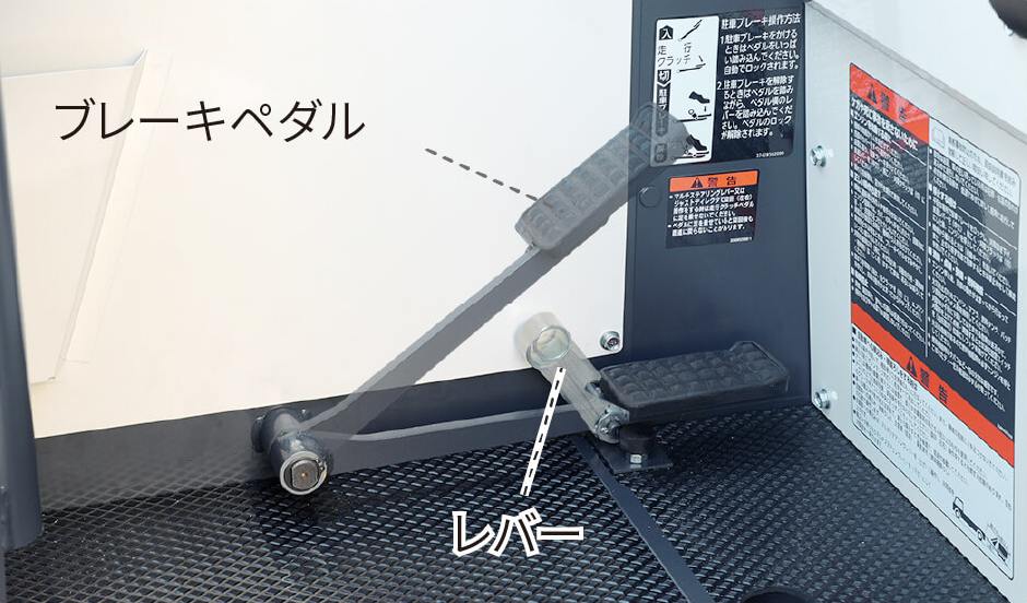 ブレーキペダルをいっぱいに踏み込めば、駐車ブレーキが掛かります。ブレーキペダルとレバーを同時に踏み込めば解除するので、足だけで簡単に操作できます。