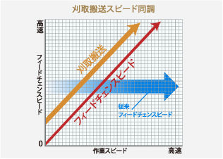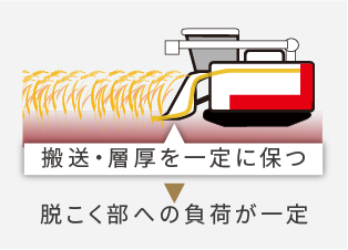 刈取搬送と脱こくフィードチェンが車速と同調することで搬送の層厚を一定に保ち、脱こく部の負荷が軽減され高速刈取や悪条件下の作業でも安定した脱こく性能を発揮します。