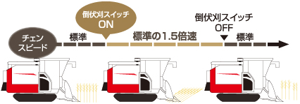 機体を停止させることなく、刈取搬送スピードを切替えることができ、部分倒伏もスムーズに刈取できます。