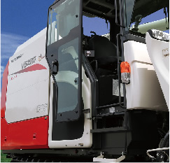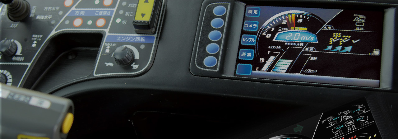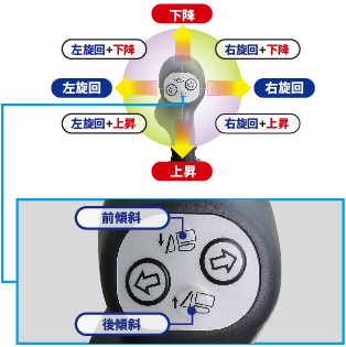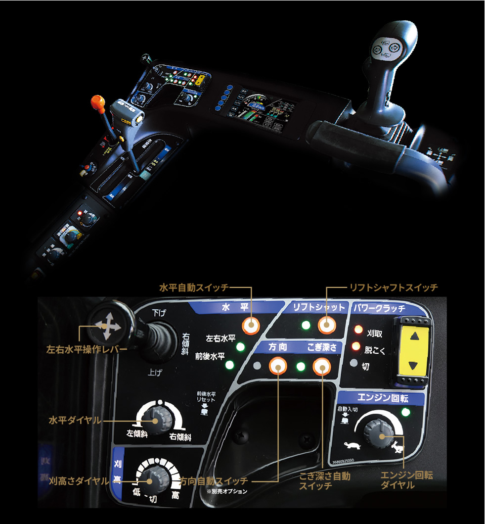 旋回と刈取部上下の同時操作が可能です。また機体の前後水平調整スイッチをレバー上に配置しました。