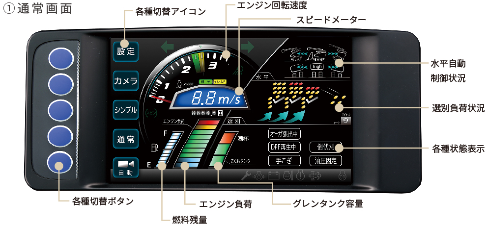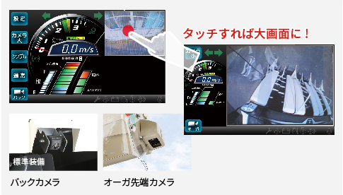 画面上にカメラモニタを配置し、機械の情報と合わせ、機体前後の状況※が確認できます。