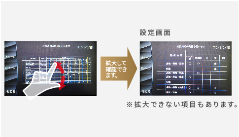 各種交換時間、油脂の容量など、メンテナンス画面で確認することができ、各種メンテナンスがスムーズに行えます。