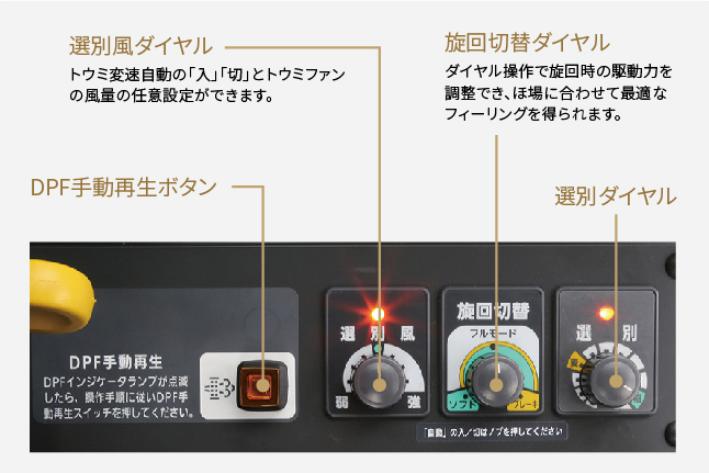 操作系のスイッチ、ダイヤル類を前方に集中配置し、作業時の操作性が向上しました。またバックライト搭載で夜間作業の視認性がアップしました。