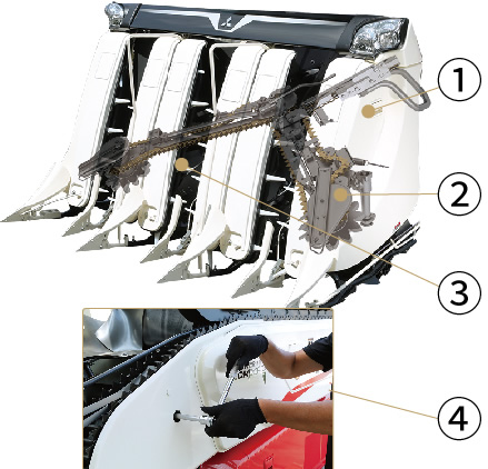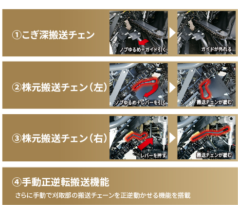 万が一の刈取部詰まりもスピーディーに除去できる機構を採用。ダウンタイムの短縮が図れ、効率作業をサポートします。