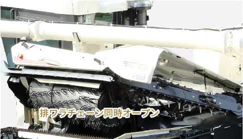 電動でこぎ胴を上昇でき、さらに同時に排ワラチェンもオープンするので、万が一の脱こく・排ワラ部の詰まりも素早く除去でき、安心して作業できます。