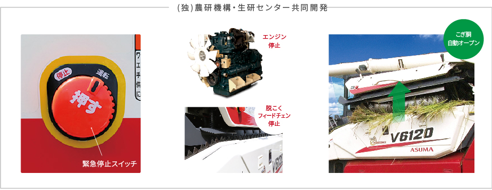 緊急停止スイッチを押すだけで、エンジン、脱こくフィードチェン、が瞬時に停止する緊急停止機能で、より安全に手こぎが行えます。