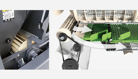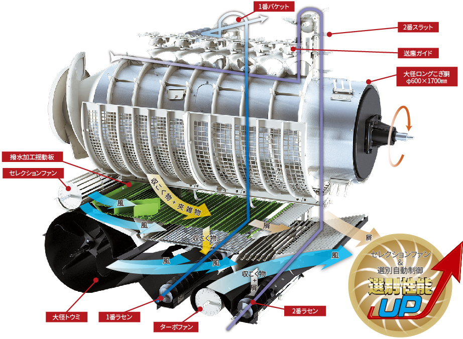 揺動板上部前方に、新たにファンを設置。脱こく処理された作物が、揺動流板上に落ちる間に夾雑物と収こく物を選別。揺動流板での選別物を適量にすることで、高効率・高精度選別を実現します。