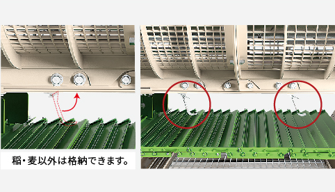 作物の脱こく状況により二番還元口位置の切替ができます。悪条件での脱こくによる、収穫物の損傷を防ぎます。