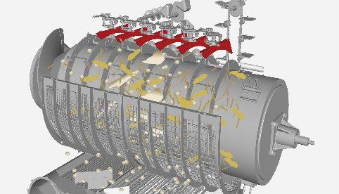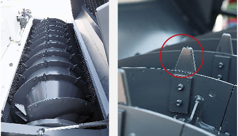 ロータ上部に可動式の送塵ガイドを6枚装備。脱こく内の一時的な過負荷を適度に逃し、こく稈・こく粒をロータ後方へ運びます。