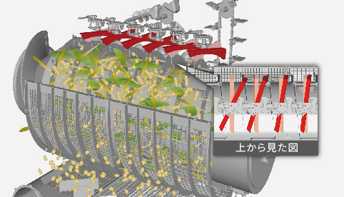 ロータ外周に取り付けたスクリューこぎ歯で作物を搬送しながら脱こく。ロスが少なく、やさしくきれいに収穫できます。