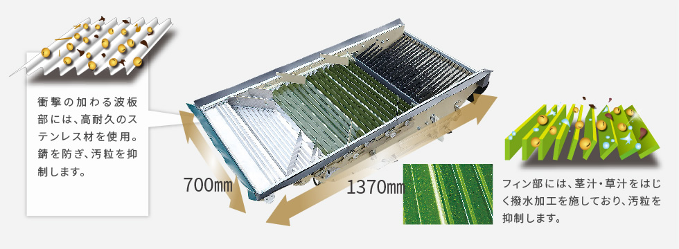 撥水性能をさらに高めたフッ素樹脂コーティングで揺動板を加工。波板部には高耐久のステンレス材を使用しており、汚粒を防ぎ、高品質のこく粒を収穫できます。揺動板上の分散性にも優れ、脱こく負荷を軽減できます。