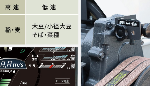 「高速⇔低速」の2段階設定で、作物に応じてロータの回転数を簡単に変えられます。また高速レンジでの作業時は、運転席のモニタ上に「高速」位置を表示します。