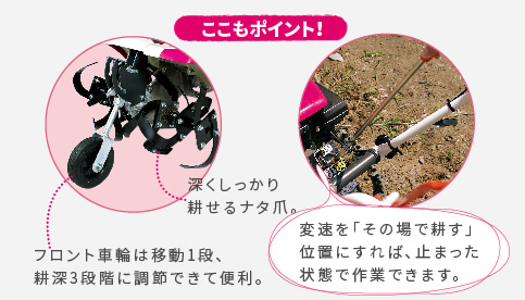 爪の内側が逆転、外側が正転する「一軸正逆転ロータリ」。爪がしっかり食い込んで、きれいに耕うんできます。爪はすべてナタ爪を採用し、深く耕せて便利。止まったままで耕せる「その場で耕す」機能もついて、簡単なのにしっかり作業できます。