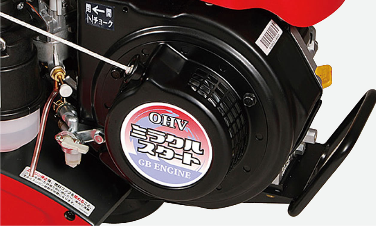 排ガス3次規制に適合した新型GBエンジンを搭載。排気に含まれる有害物質の排出をさらに低減しています。リコイルロープを軽く引っ張れば簡単にエンジンが始動できます。