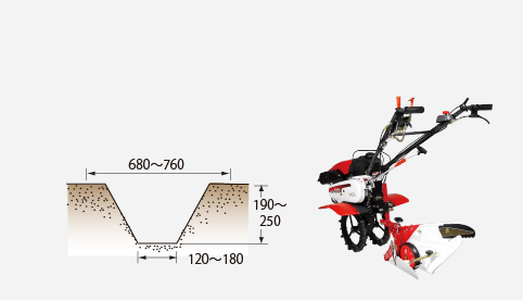 うね形状に合わせて、工具なしで2段階に耕幅を変えられます。