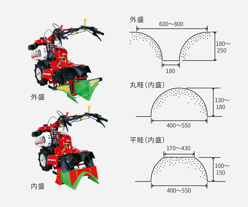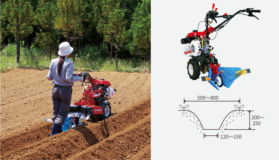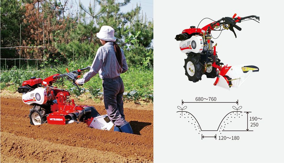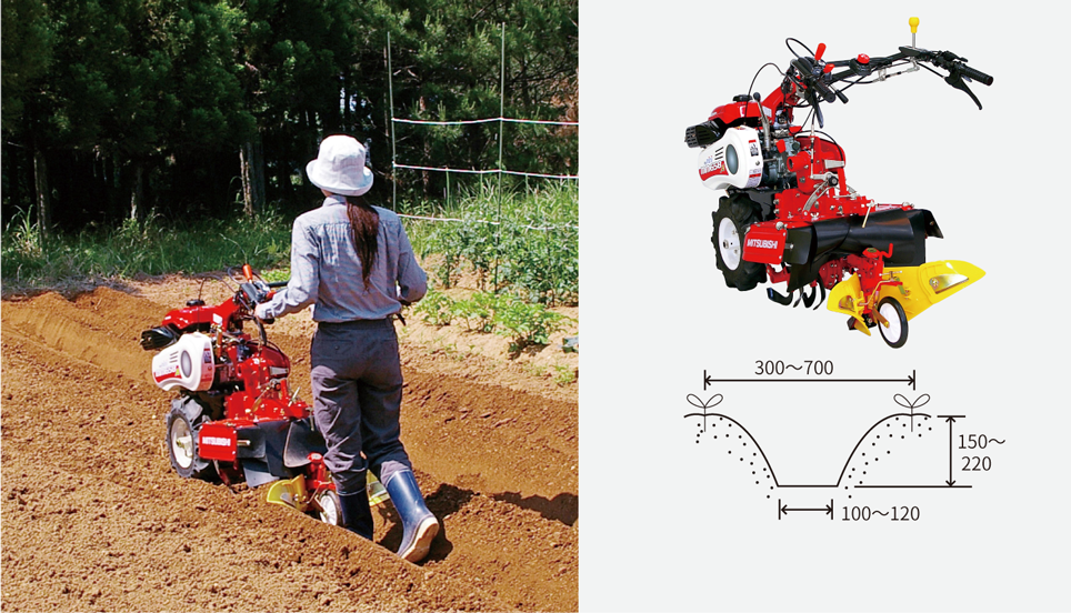 ロータリと組み合わせての培土器・溝浚器・畦立器での作業では下記の4点にご注意ください。