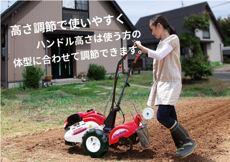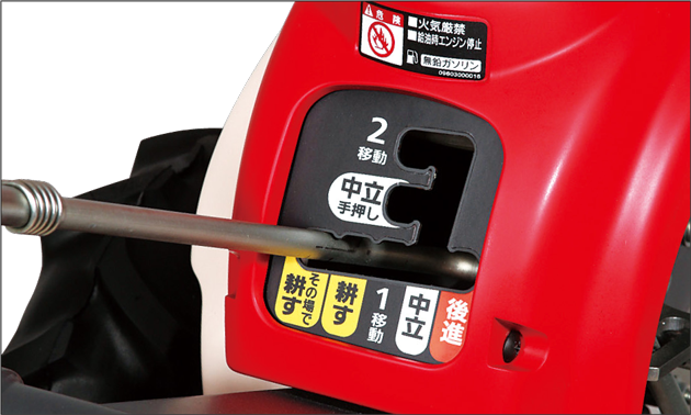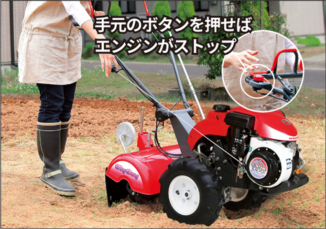 握れば作業スタート、放せば作業がストップするデッドマンクラッチで操作は簡単。さらにベストバランスで扱いやすいリヤロータリタイプなので、作業はとても快適です。