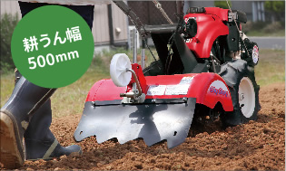 耕うん幅はワンクラス上500mm。耕うん爪も本格ナタ爪なのでしっかり耕うんできます。広い畑も効率良く、らくらく作業できます。