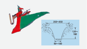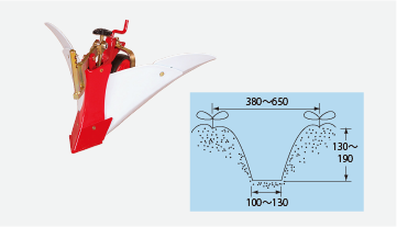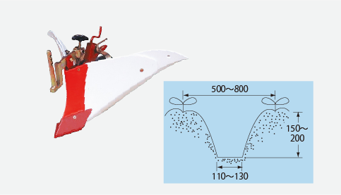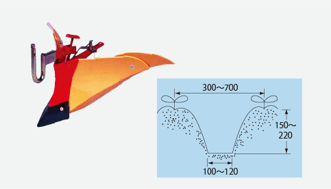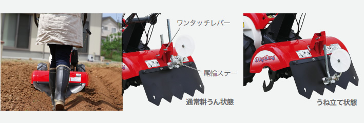 おいしい野菜づくりに欠かせないうねづくり。本格的なうね立て器なしで簡単なうね立てができる「らくらくうね立て」を標準装備しました。ワンタッチレバーで尾輪ステーを下げるだけで、うね立てができるとても便利な機能です。