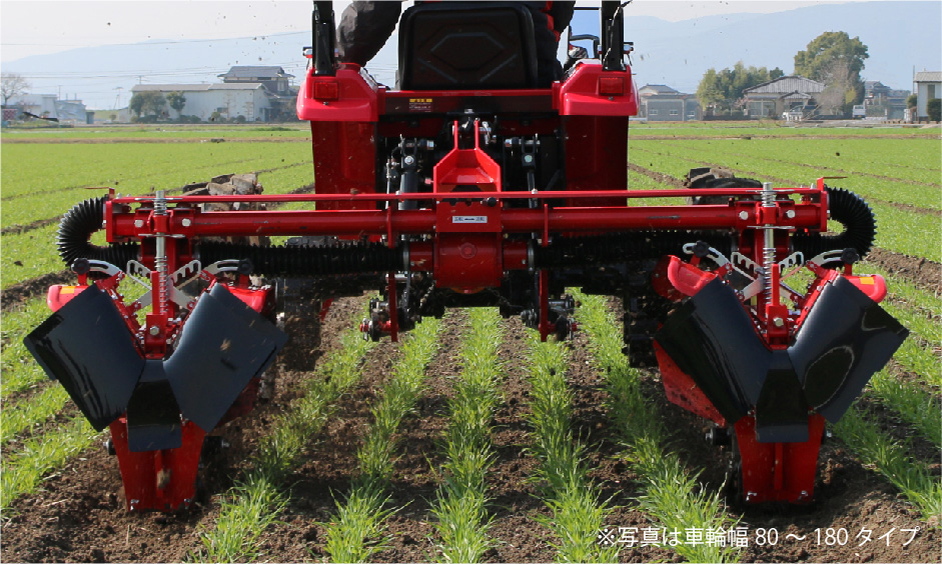 けん引式なのでロータリタイプに比べてスピーディに作業を行うことができます。様々なオプションを付けることで条間除草だけでなく、株間除草、培土作業などが行えます。